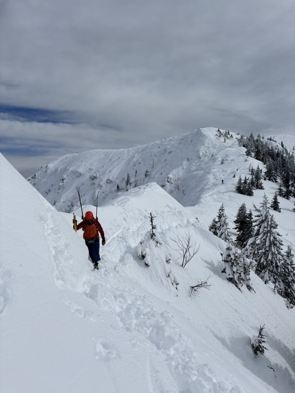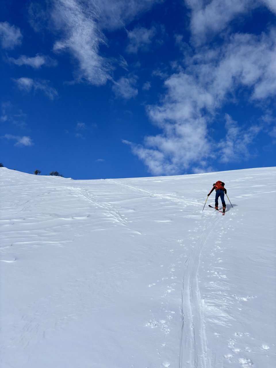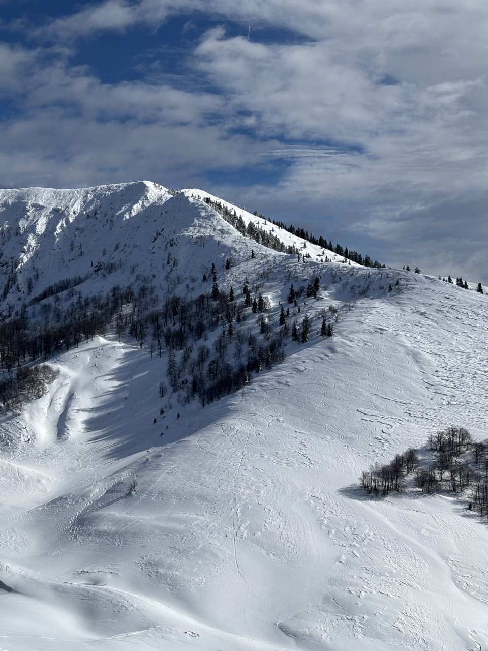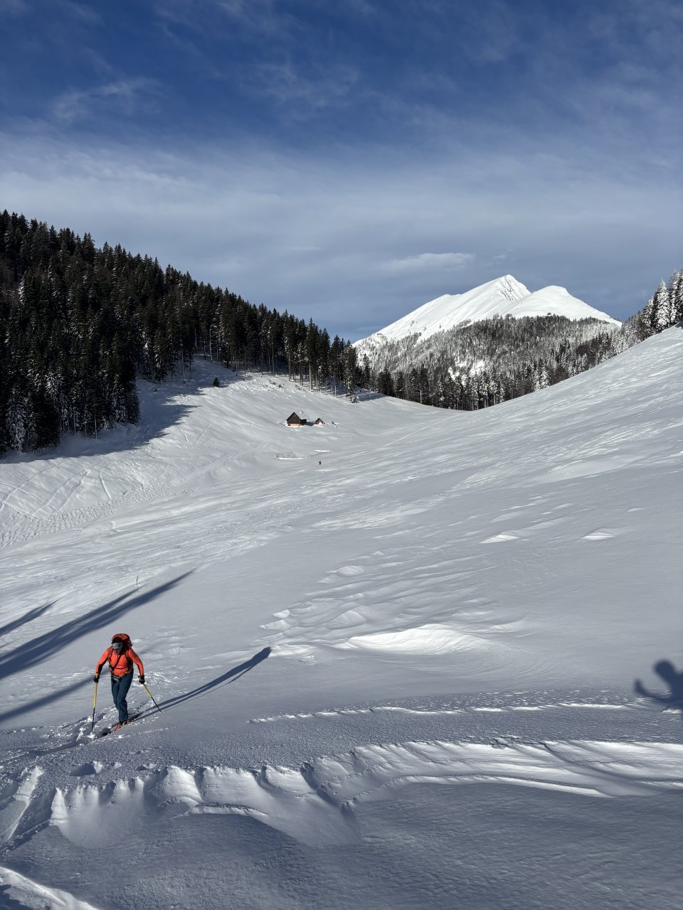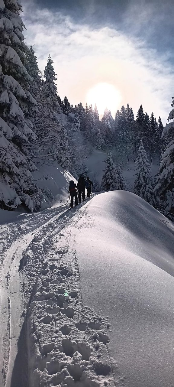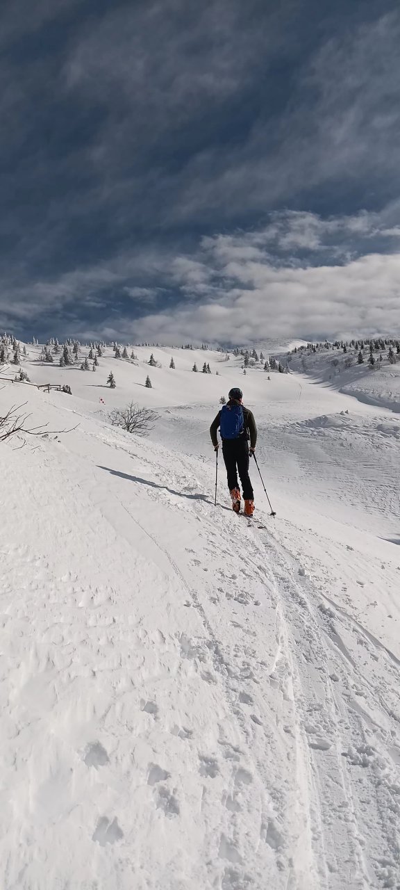 Spustiva se do koče, kože nazaj gor in naprej proti Korenščici. Iz tukaj je plan čez po grebenu do Lepega vrha, in potem še skok na Ptičji vrh. Po kratkem spustu iz Korenščice ugledava sledi, ki peljejo čez greben. Zgleda jih je nekdo isti dan potegnil pred nama. Si rečeva, da se da poštanfat. Pa še kako sva se zajeb… Itak s smučmi ni šlo nikamor, vdira se do riti. Gruntava kako je majster pred nama s smučam prišel klele čez. No zvečer sem izvedel, da je špuro potegnil Aljoša, s to razliko, da je šel v obratni smeri. Pregaziva se do odprtja, kjer se da preklopit nazaj na smuče. Potem po spihani in skorjasti snežni odeji prideva do vznožja Ptičjega vrha. Skočiva hitro na vrh, potem pa verjetno veste kaj sledi 😉 En kup vriskanja, kakor da zbudiš otroka v sebi. Po končani turi, še analiza na Pristavi.