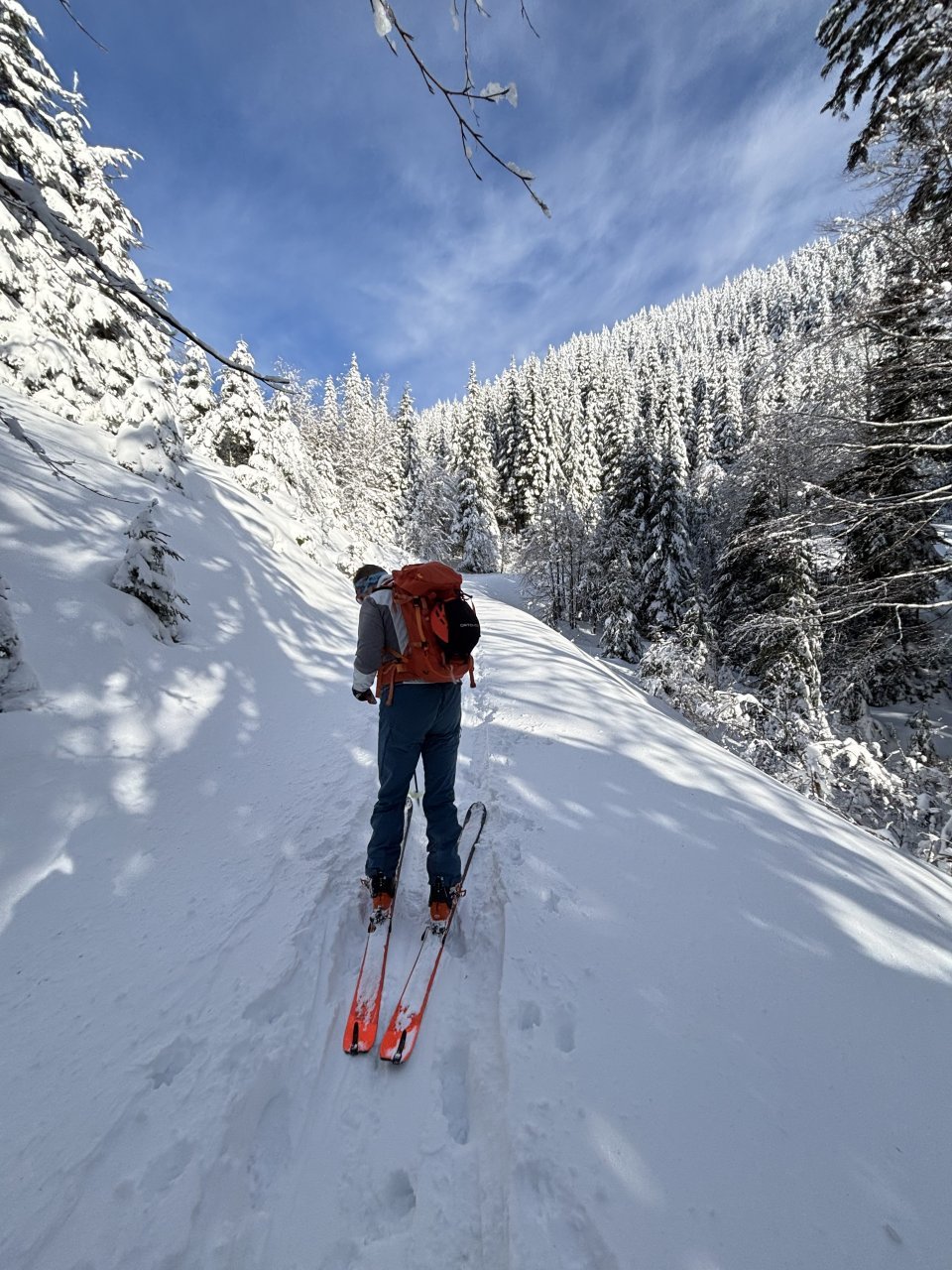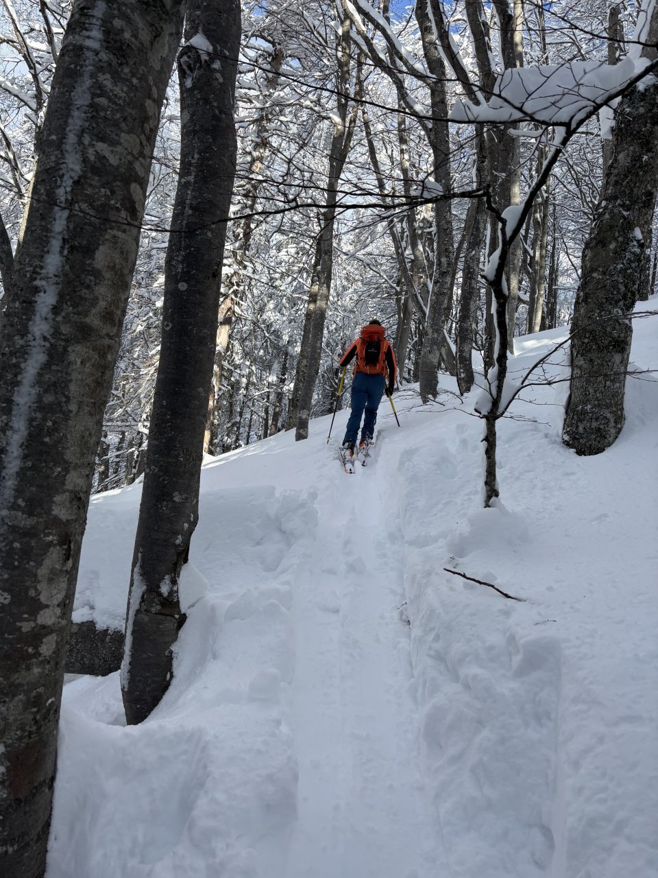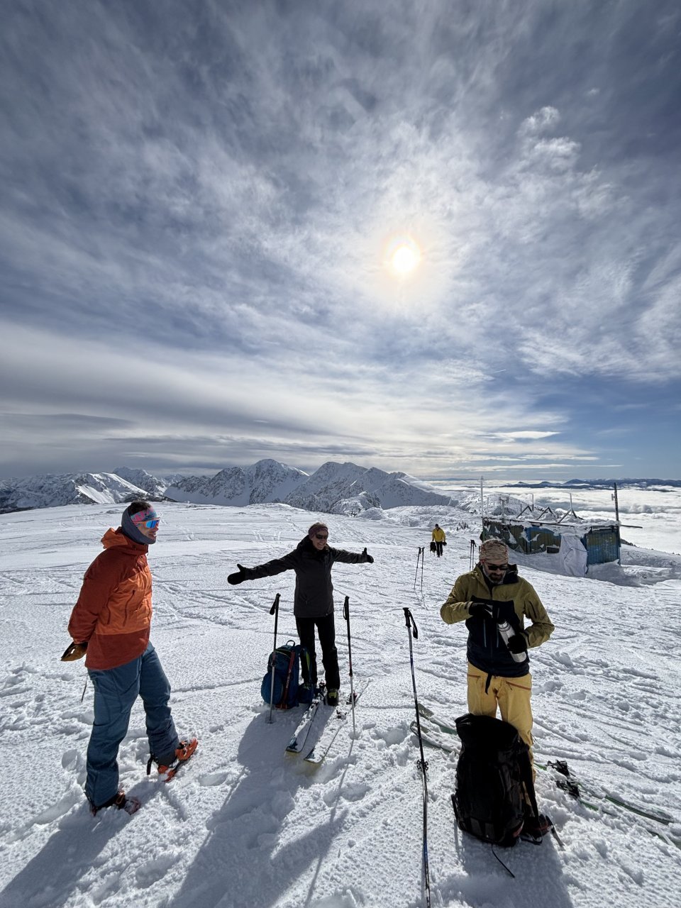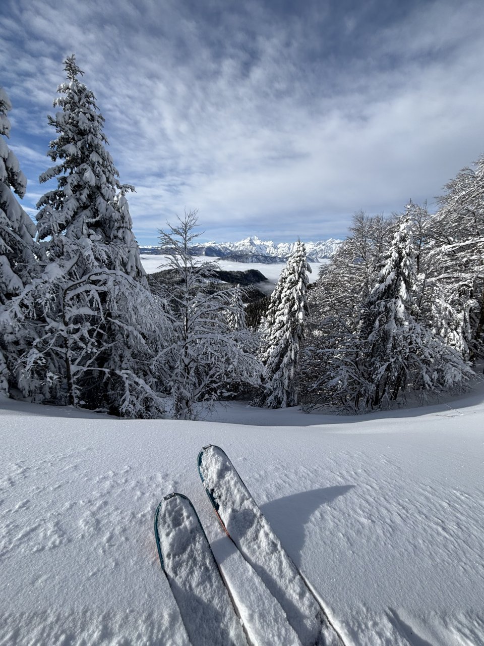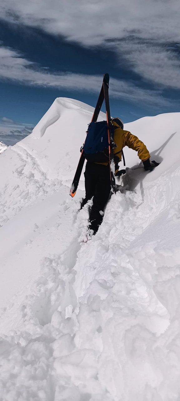 Spustiva se do koče, kože nazaj gor in naprej proti Korenščici. Iz tukaj je plan čez po grebenu do Lepega vrha, in potem še skok na Ptičji vrh. Po kratkem spustu iz Korenščice ugledava sledi, ki peljejo čez greben. Zgleda jih je nekdo isti dan potegnil pred nama. Si rečeva, da se da poštanfat. Pa še kako sva se zajeb… Itak s smučmi ni šlo nikamor, vdira se do riti. Gruntava kako je majster pred nama s smučam prišel klele čez. No zvečer sem izvedel, da je špuro potegnil Aljoša, s to razliko, da je šel v obratni smeri. Pregaziva se do odprtja, kjer se da preklopit nazaj na smuče. Potem po spihani in skorjasti snežni odeji prideva do vznožja Ptičjega vrha. Skočiva hitro na vrh, potem pa verjetno veste kaj sledi 😉 En kup vriskanja, kakor da zbudiš otroka v sebi. Po končani turi, še analiza na Pristavi.