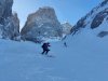 Sneg v kuluarju je bil kljub otoplitvi še vedno grifig in trd. Med smučanjem je sicer nastajalo malo moke, ki pa je celo pomagala pri smučanju. Največji problem je bil le pod vrhom, kjer so nastale grbine, širine pa je bilo za naše znanje dovolj. V desnem žlebu je bilo 5cm klože na nesprijetem, sipkem snegu tako, da sva se s Tinom odločila, da se vrneva v normalko in skupaj smo prismučali do izstopa pod ozebnikom.