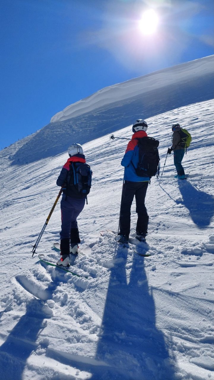 Matej in Aleksandra pa sta imela na Kotovem sedlu precej mešane razmere; skorja, grifig sneg in tudi trdo kložo, a sta vseeno suvereno, še pred nami prišla v dolino.