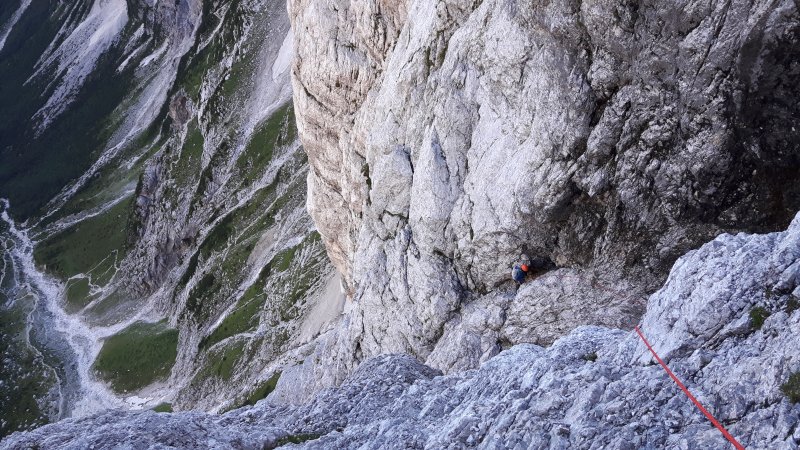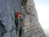Danes sva z Andrejem Ježem(AK Črna) splezala novo smer v Temenu. Linijo sva poiskušala preplezati že mesec dni prej, pa sva se uštela v težavnosti, tako nama je 200m pred vrhom zmanjkalo opreme in sva v mraku izstopila po Medvoški. Danes, pa sva pripravljena na vse, smer splezala do vrha. Linija je res izjemna z naravnimi prehodi. Skala je po večini odlična nekje dobra, so pa tudi odseki s podrtijo. V skali sva pustila kar 15 klinov, od tega 6 v najtežjem raztežaju. Smer je v prvi veliki zajedi skupna z varianto Medvoške kakih 40m, nato varianta zavije levo, midva pa sva se zapodila naravonst navzgor. V najtežjem raztežaju sva poleg šestih klinov pustila tudi zagozden zatič, s pomočjo katerega se brez problema potegnemo čez najtežji del. Prost vzpon bi na pogled ocenil z IX. Danes je bilo kljub soncu premraz, za dober poizkus, zato je to na sporedu naslednjo sezono. Morda me kdo prehiti?! Ocena A2 za najtežje mesto govori to, da je nekaj klinov v skali samo za okras. Priporočam polprofilce. Nekaj raztežajev višje se smer spet dotakne Medvoške in ji sledi pol raztežaja, nato pa zavije levo, Medvoška pa desno. Vris in skico najdete v galeriji.