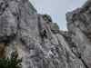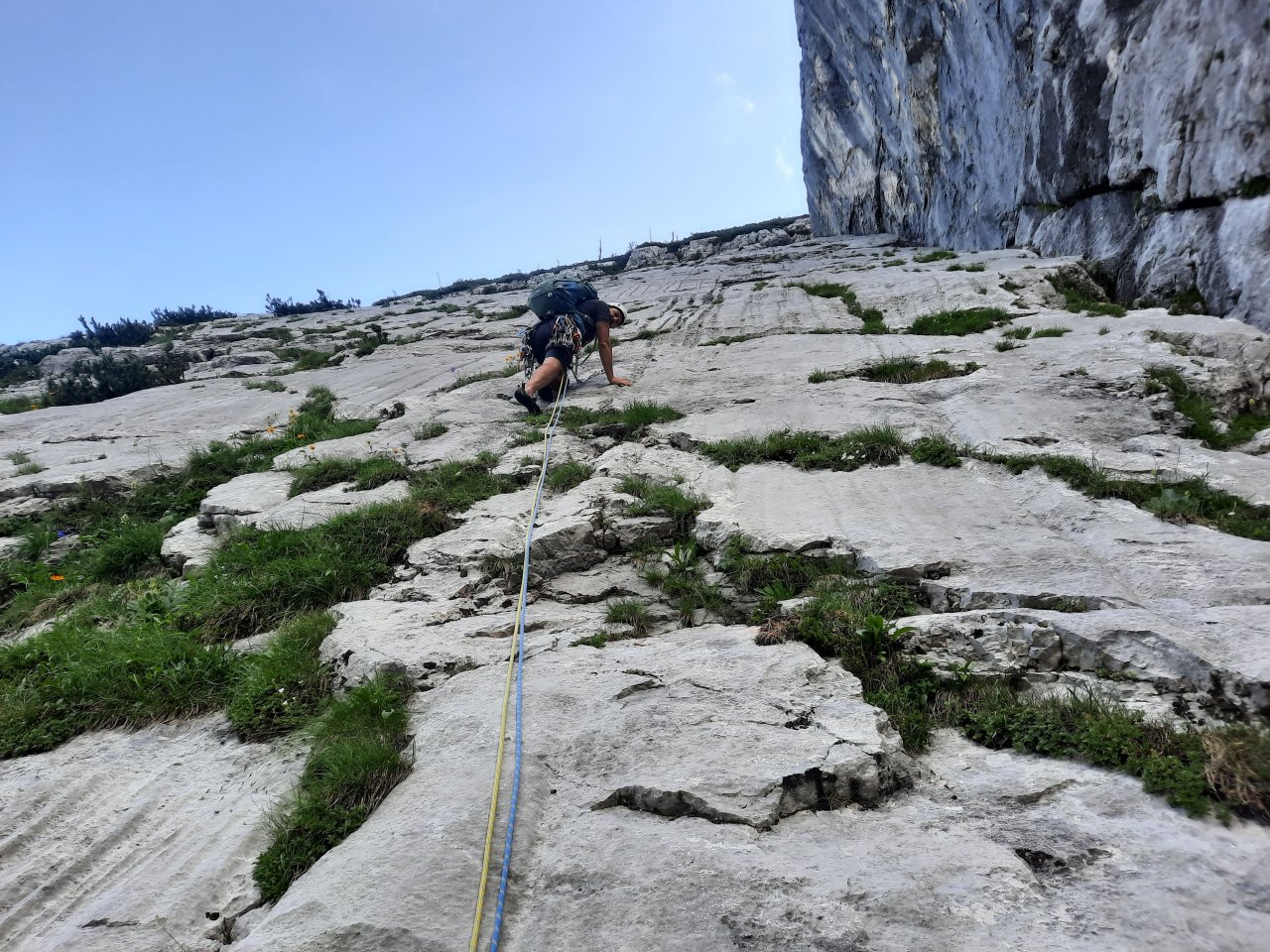 V četrtek pa sva s Petro iz AO Cerkno splezala novo smer Intenzivko v JV ostenju NŠG-ja. Smer na vstopu v Kamenkov kamin zavije levo v rahlo previsno poč, ki ti za začetek kar pošteno ogreje. Nato sledi plošči v levo do sidrišča. Sledi najtežji drugi daljši raztežaj, ki ima po mojem mnenju detajl takoj ko smer križa Pokljuško. Malo sitna prečka 6a in nato čez buhtelj tudi 6a, mogoče 6a+? v lepe plošče, ki te popeljejo na naslednje sidrišče desno od Pokljuške smeri. Zadnji raztežaj poteka po lepi poči nad rušjem rahlo desno. Na vrhu poči je še krajša kaskada in že se znajdeš na sidrišču. Smer je resnično vzorno navrtana, svedrovci so tam, kjer jih rabiš, Glede ocen tudi nimam pripomb tako kot so avtorji napisali drži. Mogoče malo pazljivosti pri izbiri obrimkov in stopov, v drugem raztežaju v detajlu čez previsek se mi je odkrušil kar dober grif.