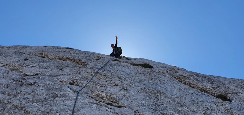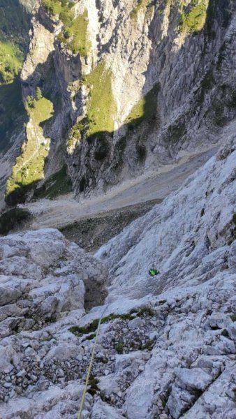 V nedeljo zvečer me je Rok iz AK Vertikala poklical in za ponedeljek predlagal Debelakovo smer v steni Velike Mojstrovke. Vremenska napoved je bila odlična zato sem se vabilu z veseljem odzval. Ob 6:40 sva se z Vršiča odpravila čez Vratica proti stenam nad Tamarjem. Do vstopa te pripelje ozka stezica, ki se nadaljuje dalje proti Travniku PP odsek gamsove riže. Po dobri uri hoda sva na vstopu, kjer srečava navezo iz Domžal, ki že pleza prvi raztežaj po vstopni rampi. Tudi midva se opremiva in začneva s plezanjem te mojstrovine Mire Marko Debelakove. Smer sledi lepim naravnim prehodom, z orientacijo nisva imela nobenih težav kljub temu, da smer vijuga levo in desno. Sidrišča so opremljena s klini, tudi klinov je tam kjer je potrebno dovolj. Detajl IV+ je 2 raztežaja pod vrhom, kar konkreten. Pa tudi vmes so se mi trojke zdele, bolj na IV. Dvojke pa bolj na trojke? Po dobrih petih urah sva bila na vrhu Velike Mojstrovke. Sledil je sestop na Vršič. Čudovito izkoriščen dan, le da je tokrat pivo odpadlo zaradi šihta:(