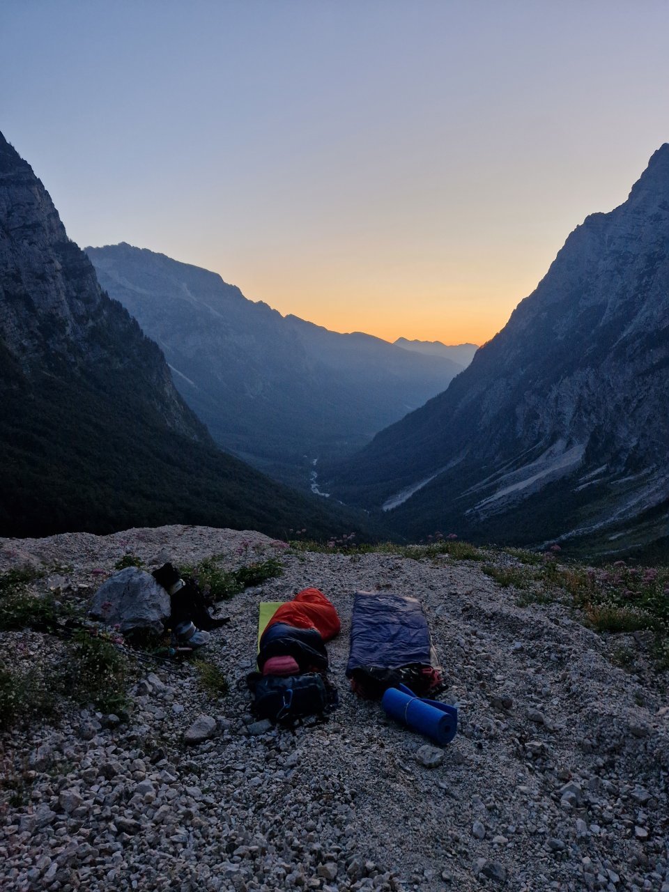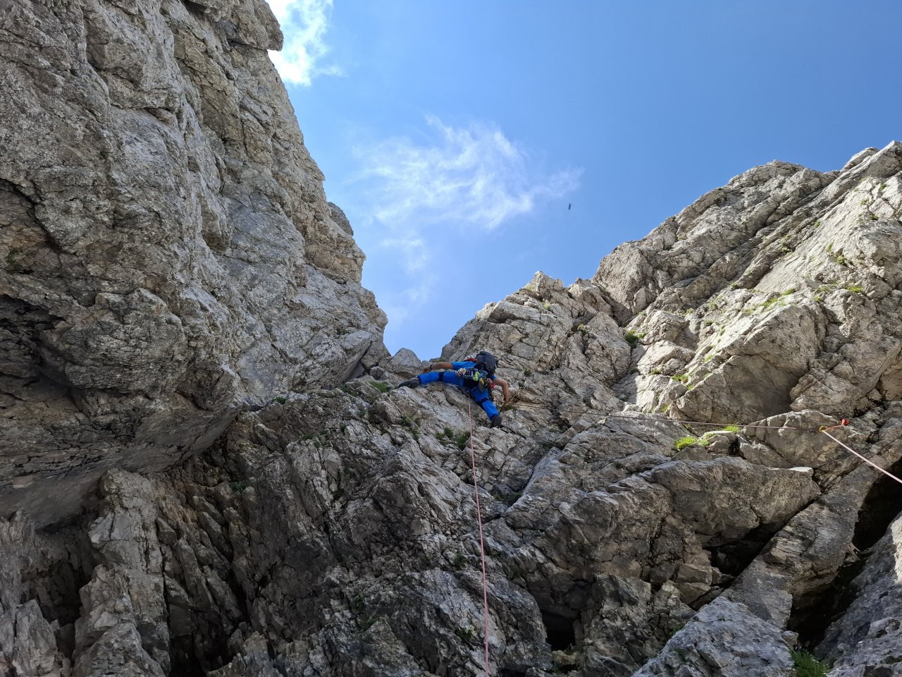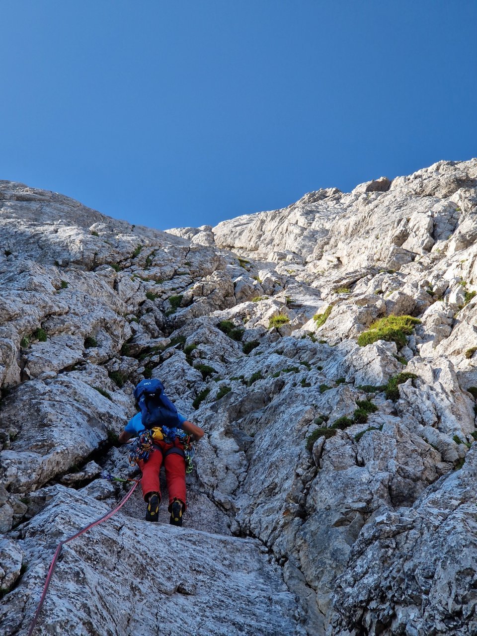 Tako smo štartali že zgodaj iz vrat in po dobrih dveh urah stali pod smerjo Svileni strah (VII-/VI-, 300m). Smer se začne zelo obetavno z strmimi zajedami in kamini, ki nas v štirih raztežajih pripeljejo do uravnave v grebenu. Tam smo se za krajši čas razvezali in odplezali še do zadnjega raztežaja čez strmo glavo. Tam nam prehod, ki sta ga izbrala Anja in Peter ni bil nabolj všeč, zato smo na konec strmega dela stene izplezali po poči bolj levo, cca. VI.